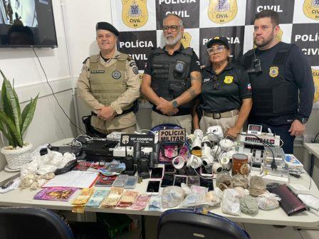 Durante as ações, que tiveram apoio de guarnições da Polícia Militar e cães farejadores, foram cumpridos mandados de busca e apreensão nos imóveis dos acusados, quando foram apreendidos câmeras e equipamentos para monitoramento, porções de maconha, crack e cocaína, balanças digitais, uma máquina para contar dinheiro e a quantia de mais de R$ 20 mil em espécie. Também foram encontrados com os três acusados cadernos de anotações do tráfico, uma faca, rádios comunicadores, um binóculo, entre outros objetos.
